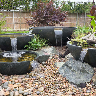 A few days after our consultation visit, we provided them with a brand-new design. Since the homeowners travel frequently, they wanted something beautiful yet low-maintenance. So a Fountainscape design came to mind straight away — a series of four elegant fountain bowls, each spilling gently into the next. The largest bowl, an impressive 60-inch centrepiece, creates a stunning visual impact when the water begins to flow.